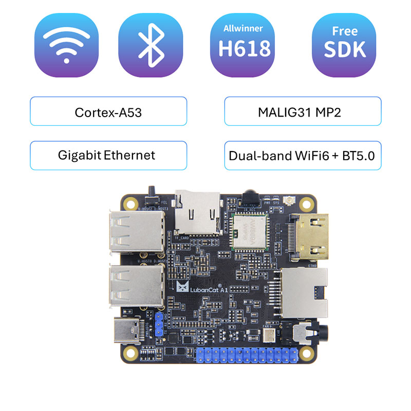 Використовуючи AllWinner H618 як основну мікросхему, з двосанковим бездротовим модулем WIFI6+BT5.0, USB2.02HOST/OTG, HDMI2.0, GIGABIT Ethernet, тримачем картки TF та іншими периферійними пристроями, 26PIN невикористаних штифтів, що підтримують GPIO, SPI, UART, PWM.