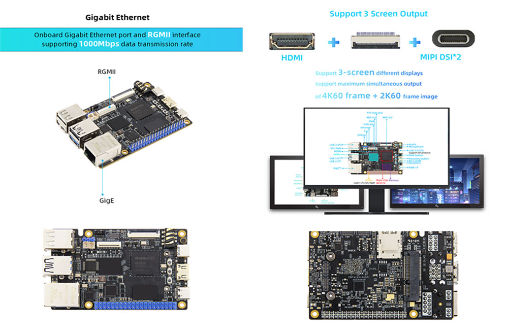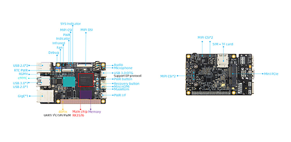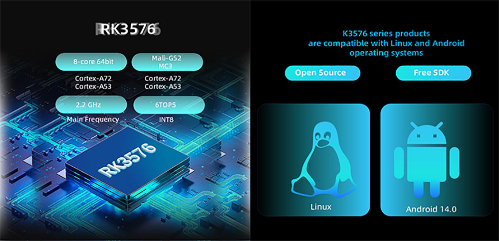 В основі RK3576 SBC лежить чіп RK3576 Rockchip, розроблений для високоефективних обчислень для різноманітних навантажень. Його 8-ядерна гібридна архітектура-із 4-кратними ядрами продуктивності Cortex-A72 та 4-кратними ядрами ефективності CORTEX-A53-поєднаною з GRAM MALI-G52 MP4, створює двигун обробки, який переважає у багатозадачних, графічних завдань та паралельних обчислень.