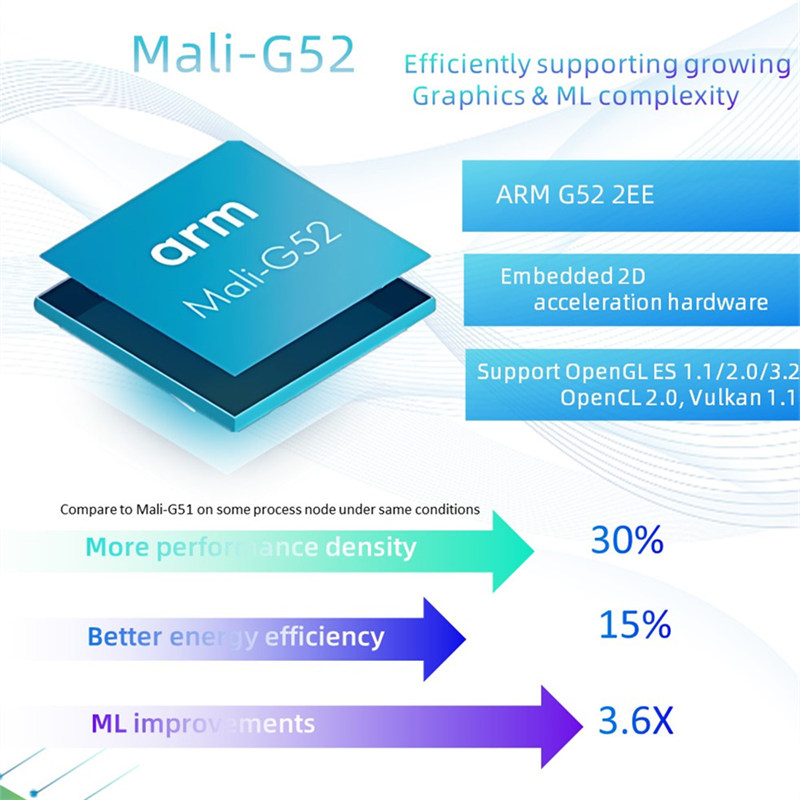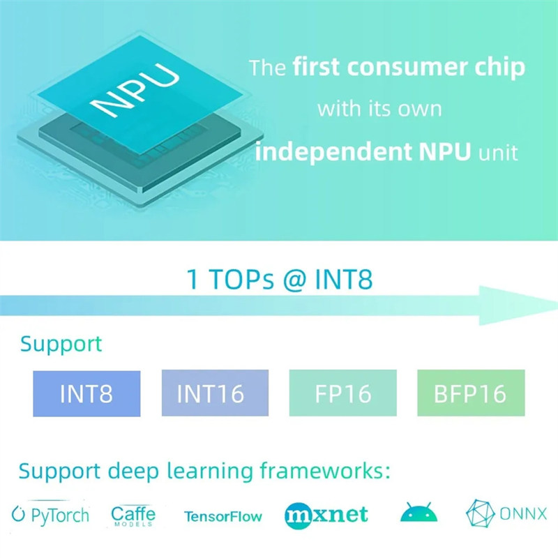 • GPU підтримує OpenGL ES3.2/2.0/1.1, Vulkan1.1; VPU може реалізувати 4K 60 кадрів в секунду H.265/H.264/VP9 Відео декодування та 1080p 100 кадрів в секунду H.265/H.264 Кодування відео; NPU підтримує Caffe/TensorFlow та інші мейнстрімічні перемикання моделей архітектури.