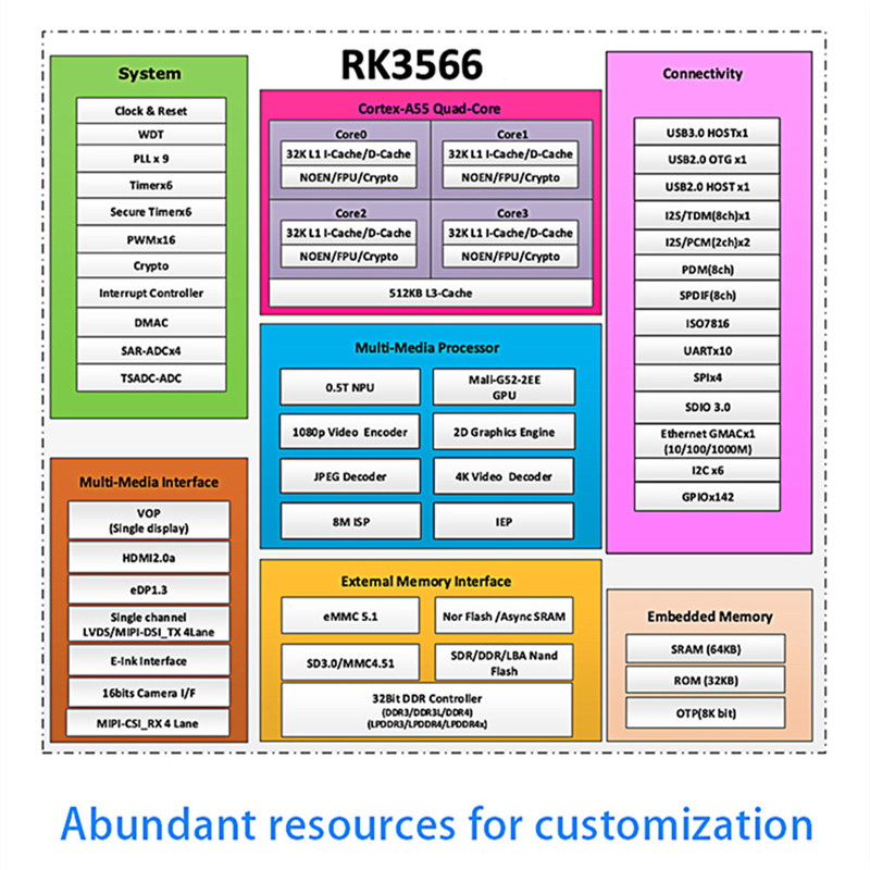 • RK3566 приймає 22 -нм вдосконалену технологію, з основною частотою до 2,0 ГГц, процесор може бути оснащений до 8 Гб ємності пам'яті, яка може досягти 32 -бітної ширини біт і частоти до 1600 МГц.